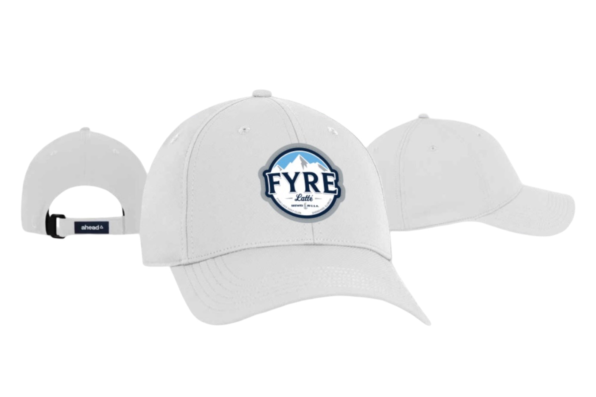 Gfore Fyre Hat white with navy letters and golden bear on side.