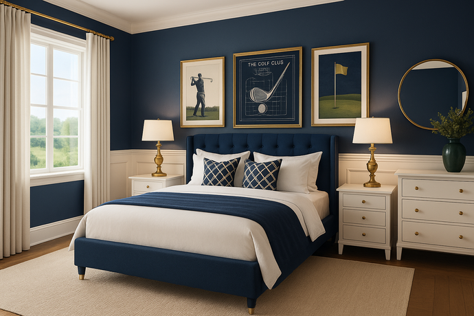 A farmhouse-modern aesthetic anchored in navy, white, and gold — understated, elegant, and unmistakably Fyre.